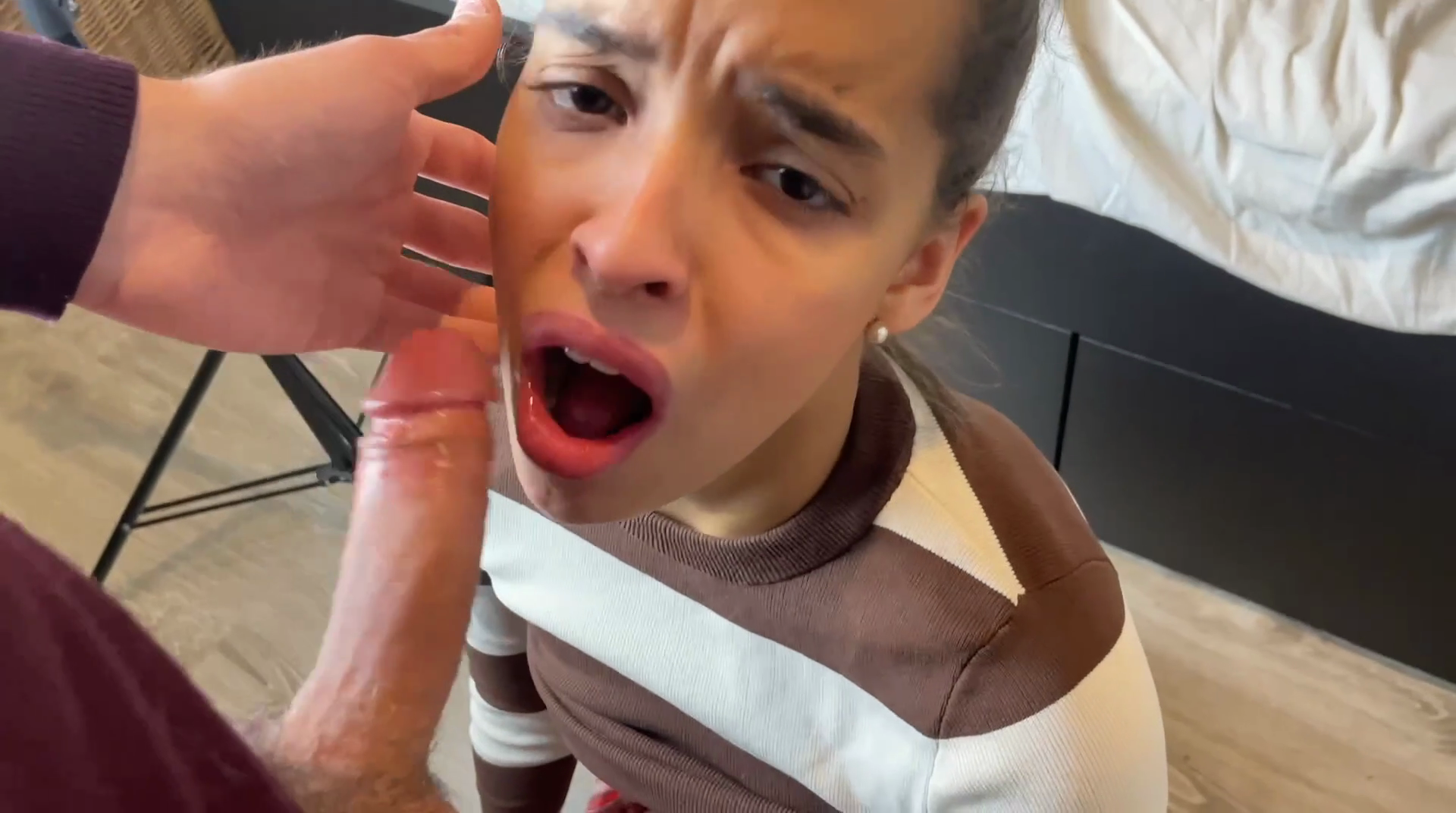 I suck his dick deep in my tiny throat and gag which makes my pussy dripping wet daddy